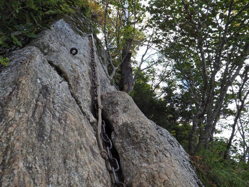 五合目小屋跡を過ぎると梯子、鎖場が連続する。八合目御来迎場〜山頂間は鎖場・岩場が多い。
