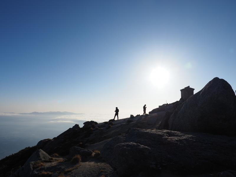 なかなか登っている最中は風が強く、山頂まで寒くて辛いかと思いましたが途中から強い風はなくなりました。鎖場は3ヶ所ほどあります。稜線に出る手前でご来光!綺麗ですね、今日は快晴です。そして烏帽子岩の2本の鉄剣と鳳凰三山と富士山。鉄剣は甲斐駒ヶ岳の特徴と言ってもよいと思いますがなぜなのか…