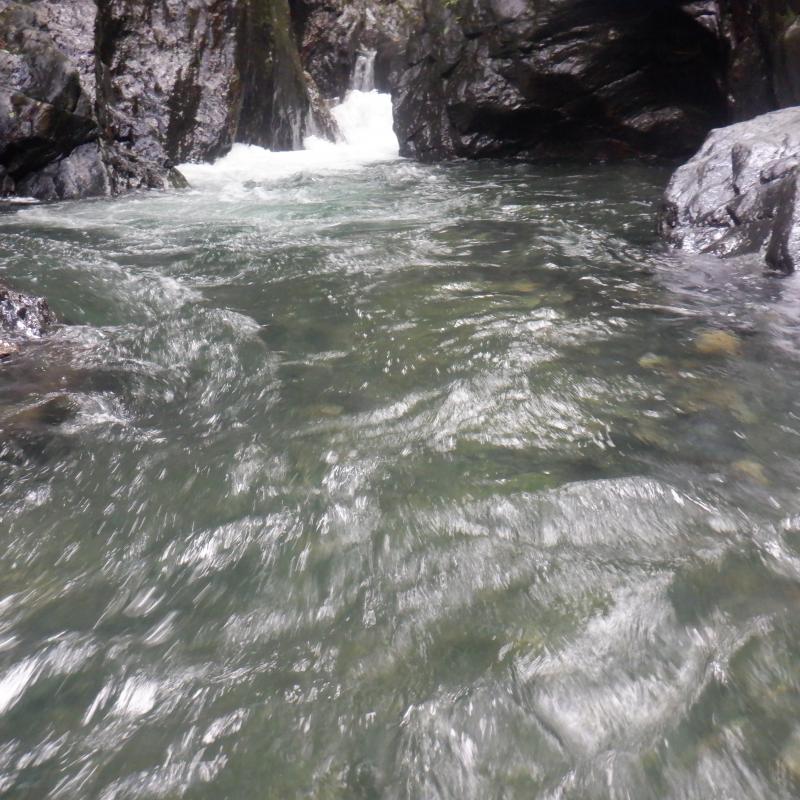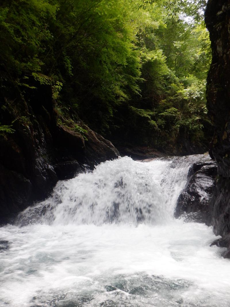 しばらく進むと、大きく右に曲がった地点に深い釜が現れました。写真では大きさが伝わりませんが、この釜の空間は案外広く、右岸側は特に足がつかないほど水深が深くなっています。