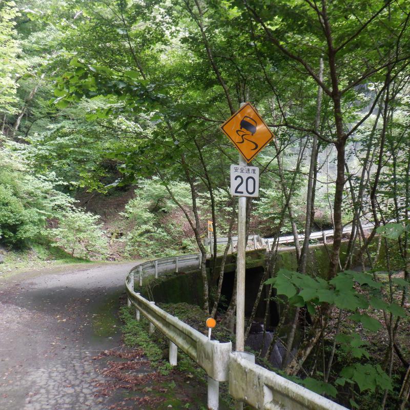 「安全速度20」の黄色看板が沢への入口。枝沢の下降は容易。ほんのわずかで本谷へ降り立つことができます。