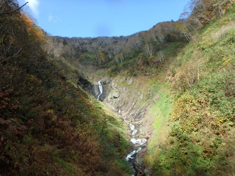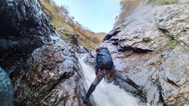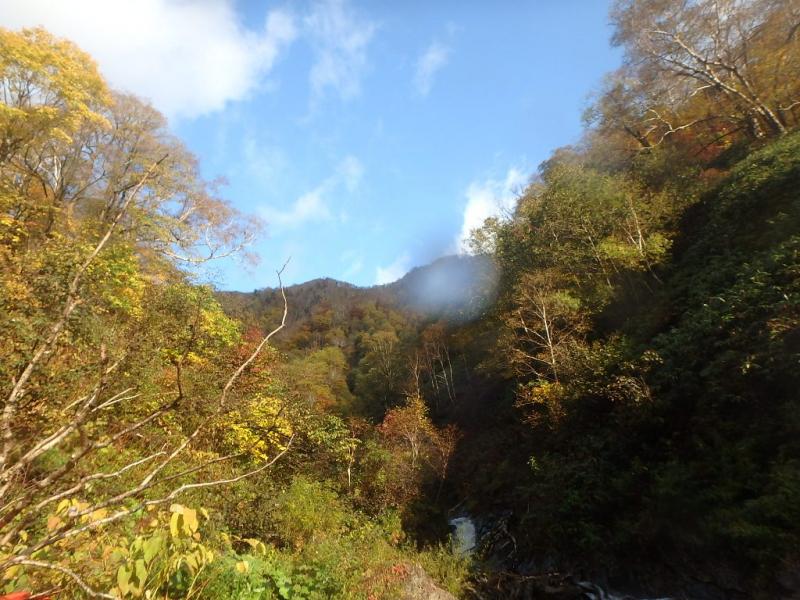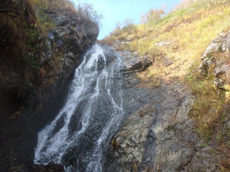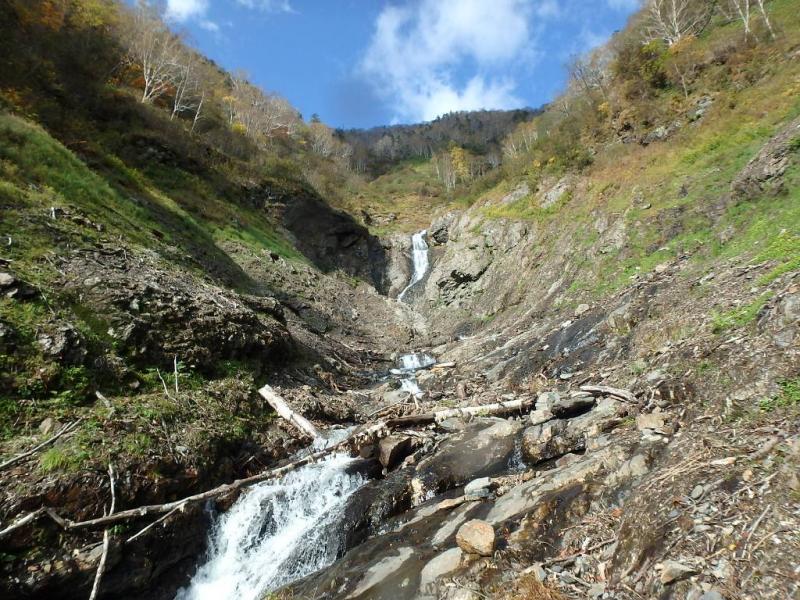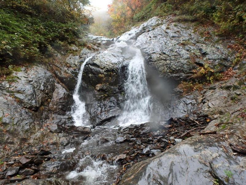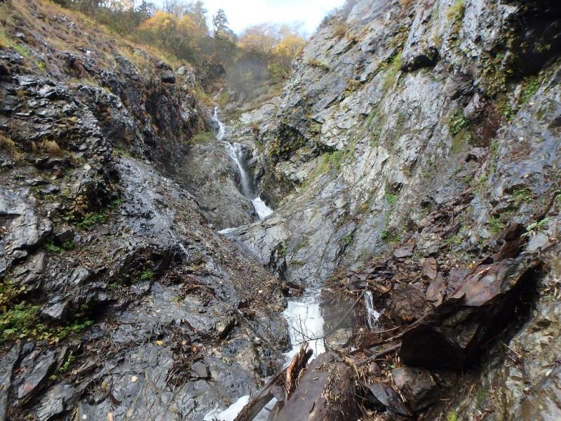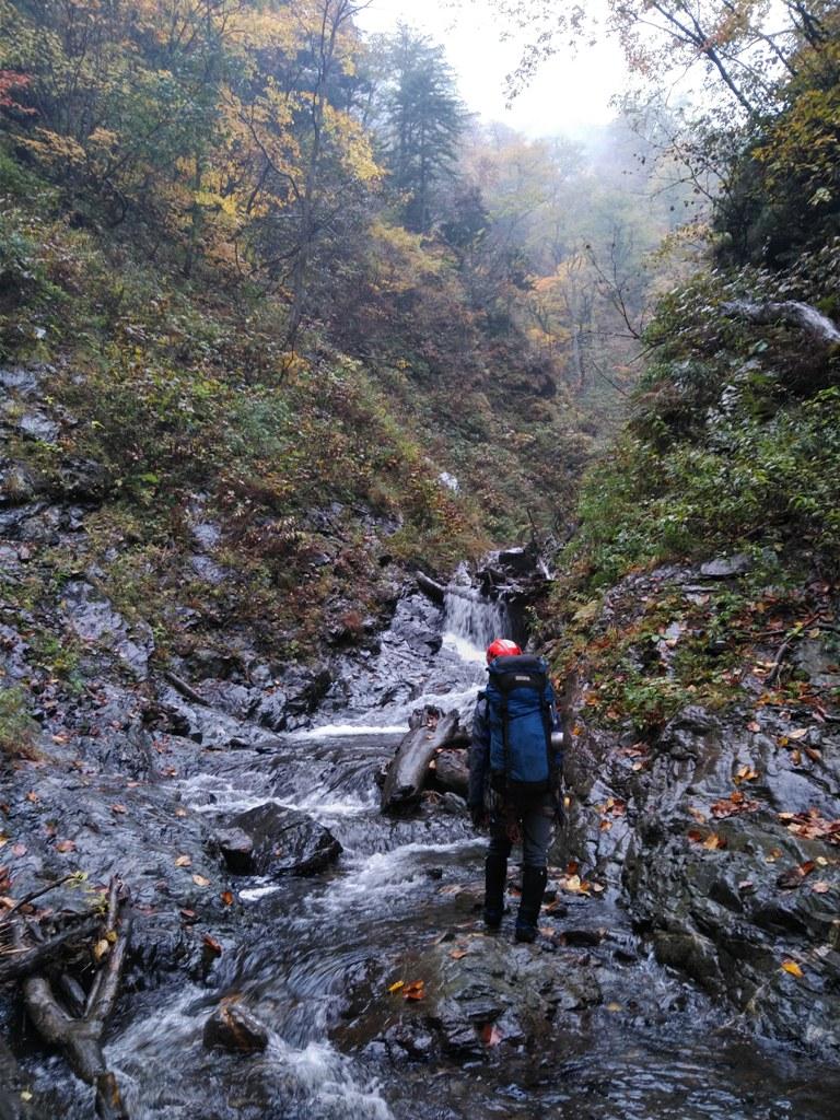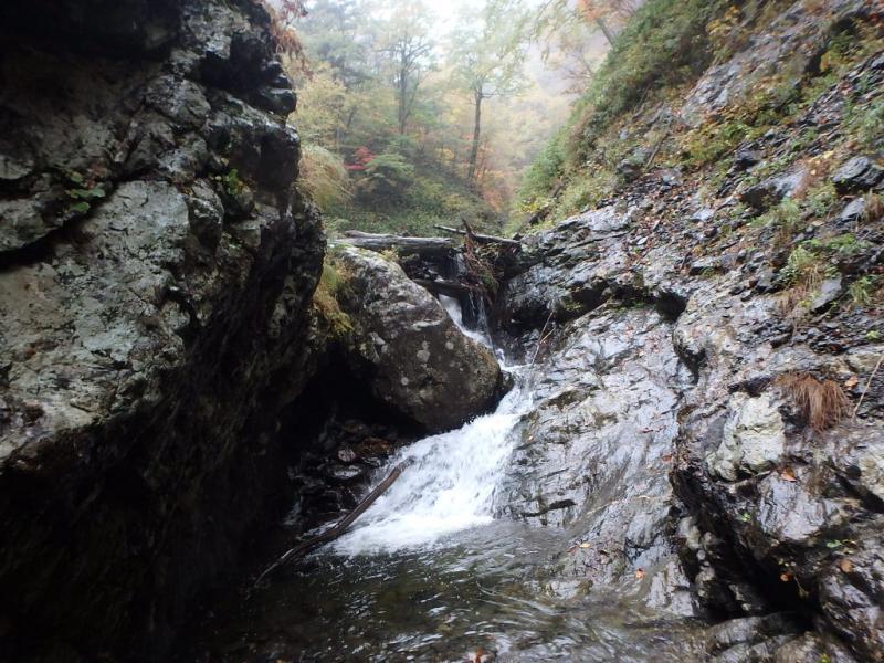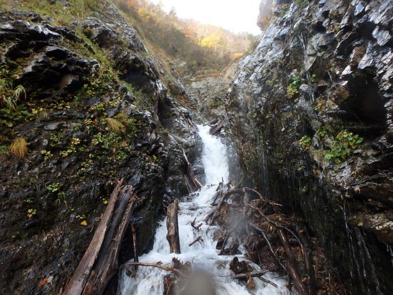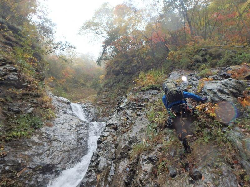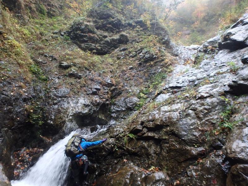 夜中雨が振り心配だったが増水はほとんどなし。前日とは打って変わった秋晴れの一日がスタート。テン場からすぐ上部でこの沢の核心部となるゴルジュとなる。ここも直登できない滝が岩盤の中を流れ落ちていく。ここで思いのほか時間を費やししまった。ようやく抜けると30mの大滝。いつもはこの下部で雪渓が残っているが流石に10月ともなると跡形ものなく消えていた。