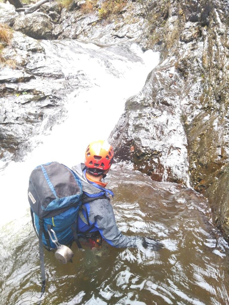 650m付近の連瀑帯、800m付近からのゴルジュ、その後の30mの大滝の処理が核心。