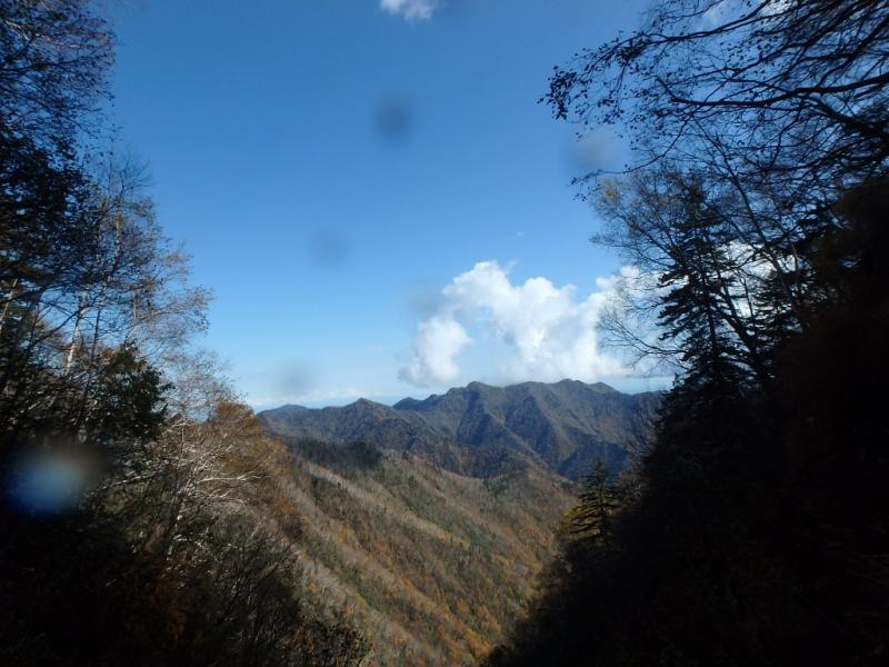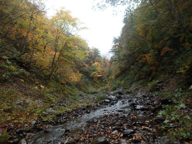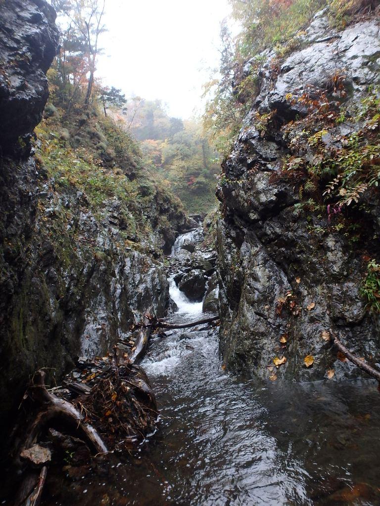 同じ山岳会の二人と札幌を出て高速道路で一気に中札内まで。十勝方面に入ると予報通り小雨がぱらつく。初日は2,3時間の行動時間なので朝がゆっくり出発なのがうれしい。コイカクシュサツナイ川出合いを出発したのも11時半とかなり遅め。すぐに東面沢に入渓。砂防ダムを3つほど越えしばらくすると両岸が切り立ったゴルジュ地形となる。雨で気温も低いが紅葉で彩られた渓相はとてもきれい。650m付近は直登不可の滝が続き左岸尾根からまとめて高まく。
