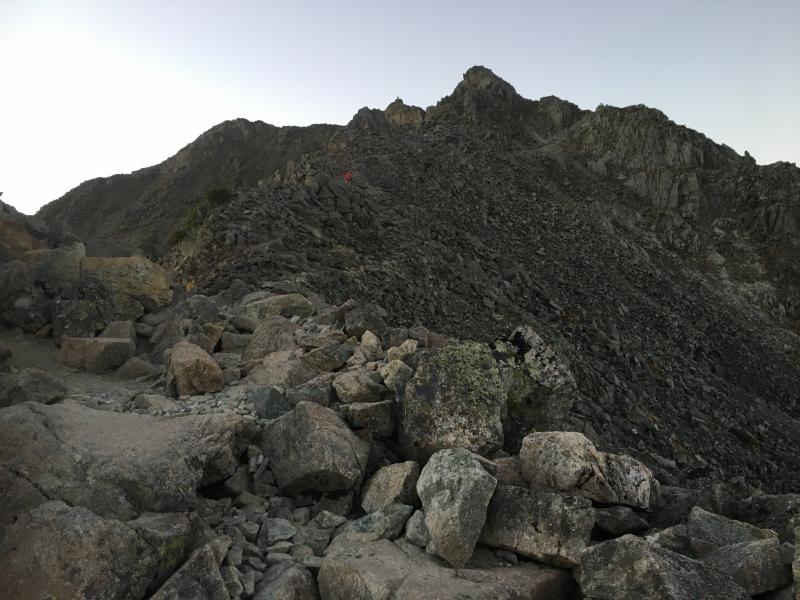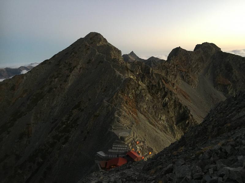 5時半に穂高岳山荘を出発。ヘッドライトを点けましたが陽が出てきたのですぐに不要に。