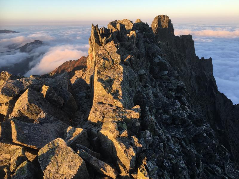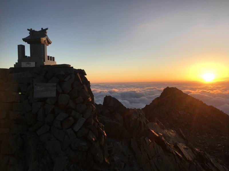 奥穂高岳山頂からは雲海から上がるご来光、槍ヶ岳やその先の黒部の山々が見えました。