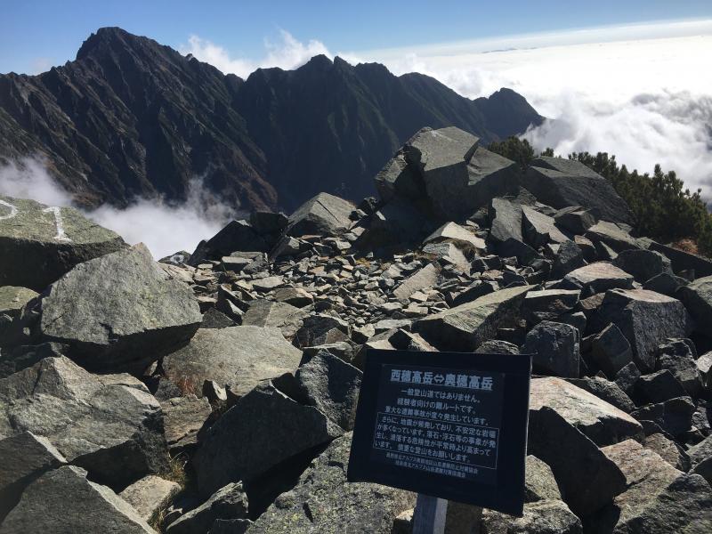 - 奥穂高岳-西穂高岳:一般登山道ではありません。危険箇所多数。間ノ岳付近は浮石注意