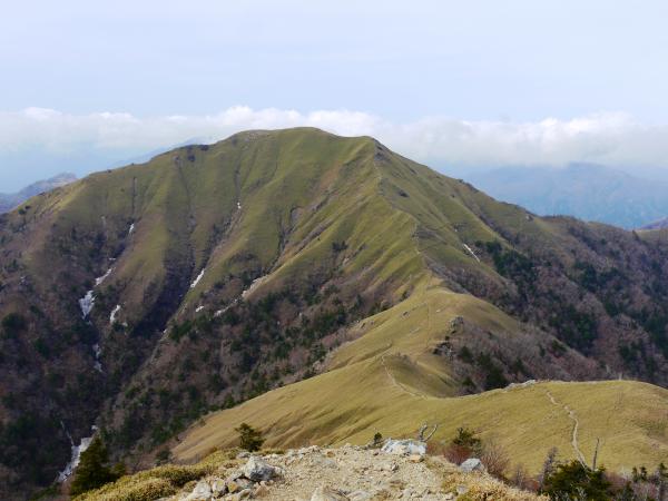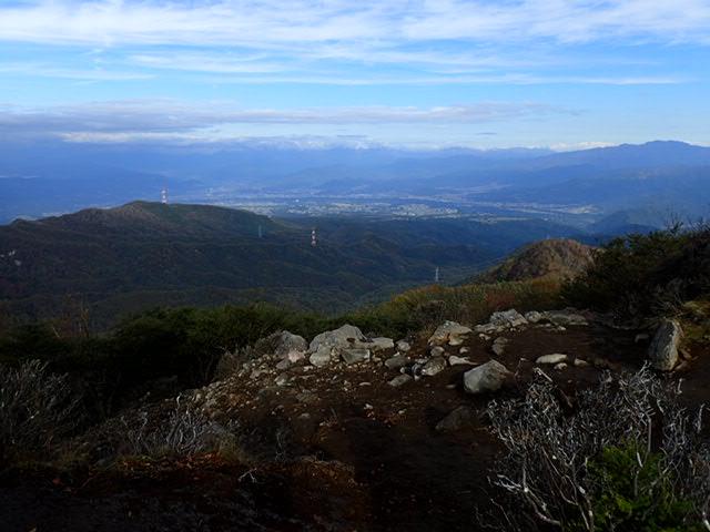 広いが景観はイマイチなここから徒歩2分でビュースポットだ。今までの急登と比べてなんと平和な道だろう。世の中平和が一番ですよ、えぇ。ともあれ、進むと標高は別にしても「ここに標識で良くないかな?」と思わせる景色が!沼田・新潟方面が綺麗に見える。東に目を転じれば、日光白根山はすっかり雪をかぶっていた。苗場にしなくて良かったぁとか自己肯定していると、風が気持ち強くなってぐんぐん冷えて来たので、そそくさと退散。