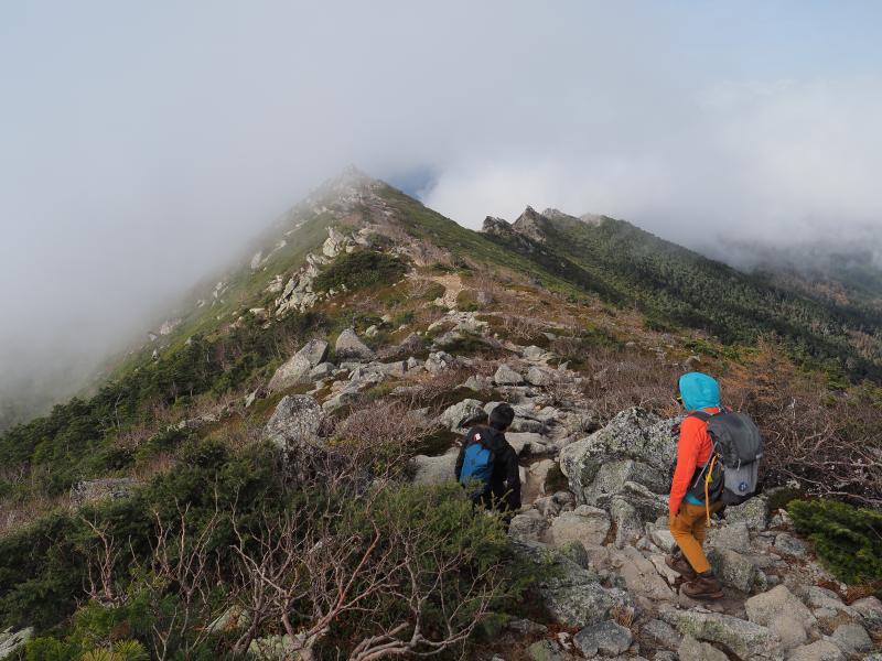 金峰山山頂で合流。金峰山山頂にある五丈岩は相変わらずどっしりしています。もう何年も前ですが、甲武信ヶ岳へ縦走したのが懐かしい。あの時は11月頭くらいでもう雪がいくらか着いていてとても寒かった記憶があります。さすがに写真撮影したり休憩してると寒いのでダウンジャケットを羽織って岩陰で休憩しました。そしたら急にガスが上がってきて北奥千丈ヶ岳や甲武信ヶ岳方面が見えなくなってしまいました。展望が悪くなってきてしまったので富士見平へ戻ります。