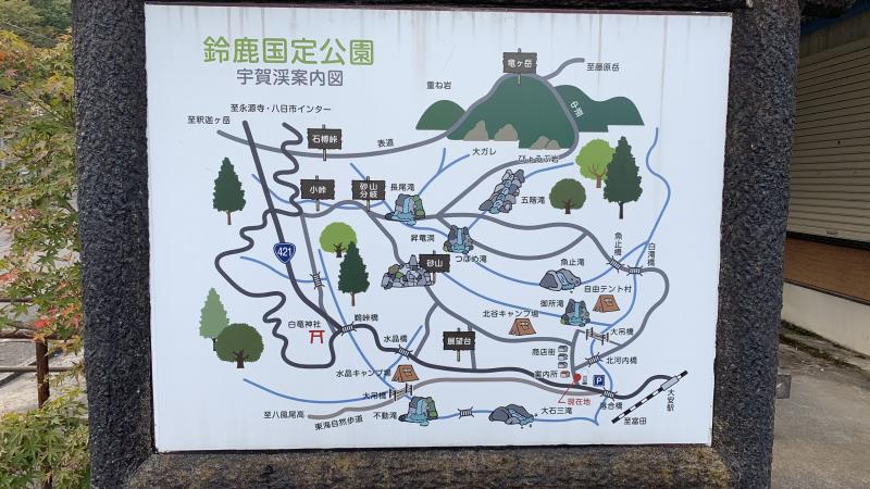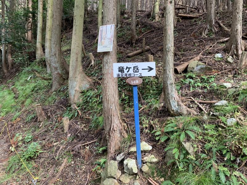 - 宇賀渓キャンプ場→15分→遠足尾根分岐→110分→クラ→20分→竜ヶ岳→15分→クラ→90分→金山尾根分岐→10分→宇賀渓キャンプ場