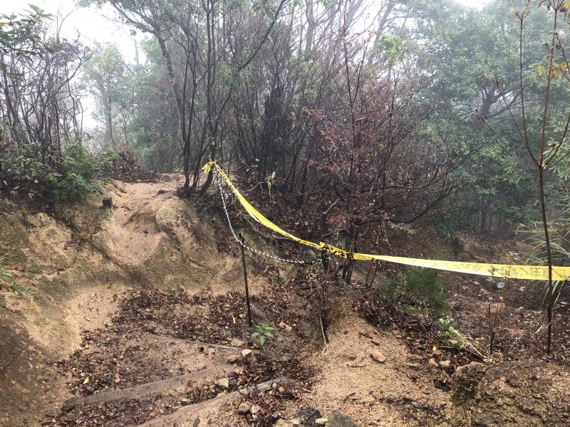 ・菊水山から天王吊橋への下りは、相変わらず迂回路を使う状態です、元のコースの崩壊の状態から、もうこれが主コースになるのではないでしょうか。迂回路は足下もしっかり整備され、安全に歩けます。