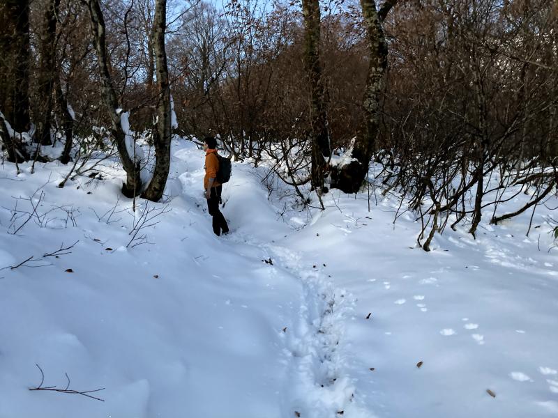 登りは西黒尾根。鉄塔を過ぎると雪が多くなってきます。雪の深さは膝付近。時々踏み抜く所は腰付近。トレースがしっかりあったので助かりました。