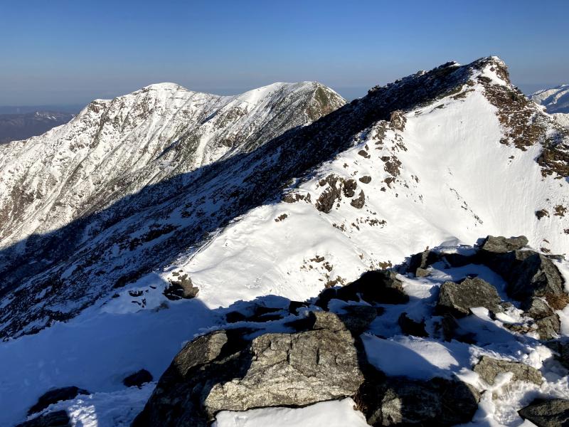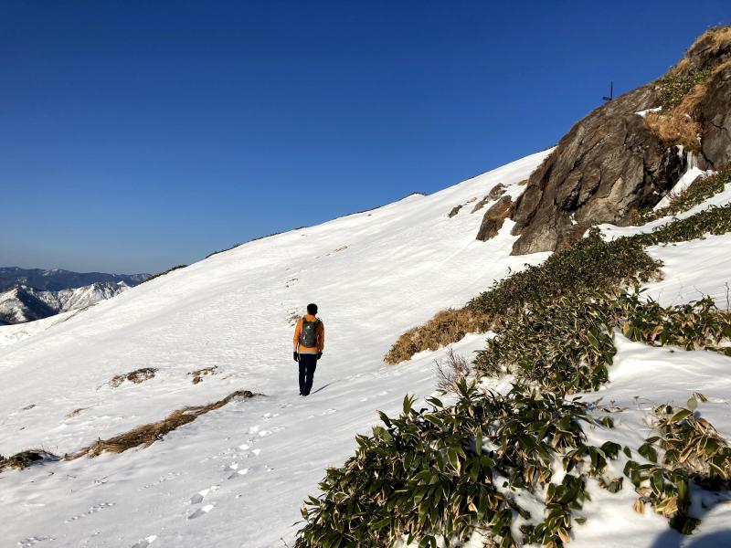肩の小屋から万太郎山や平標山の主脈方面を見ると、当然トレースはなく岩が所々出ていますが、雪がしっかりついています。