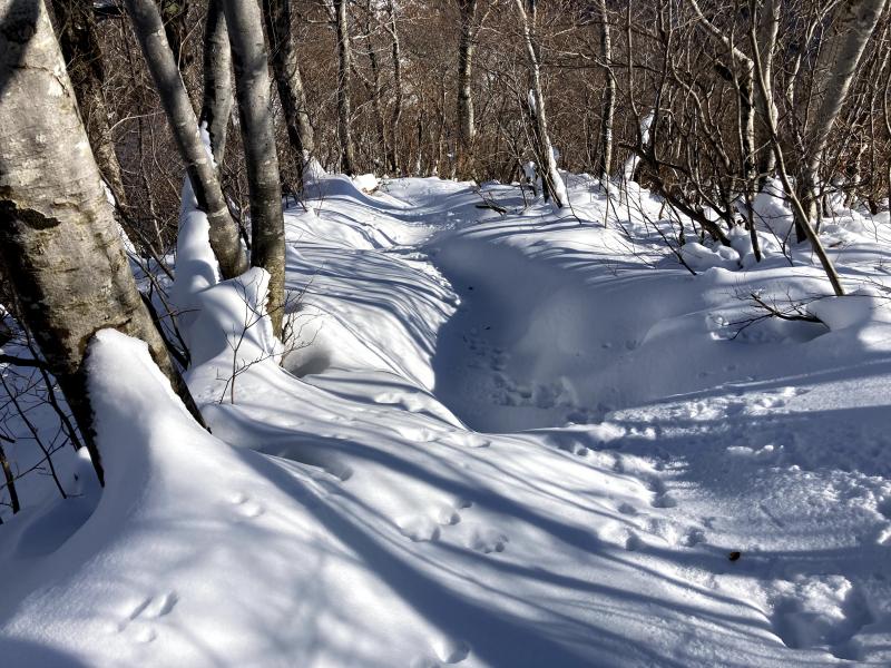 下山は天神尾根。時間が早かったのでロープウェイに乗らずに田尻尾根で下りましたが、こちらはノートレース。膝付近でサラサラした雪だったので意外と快適に下れました。