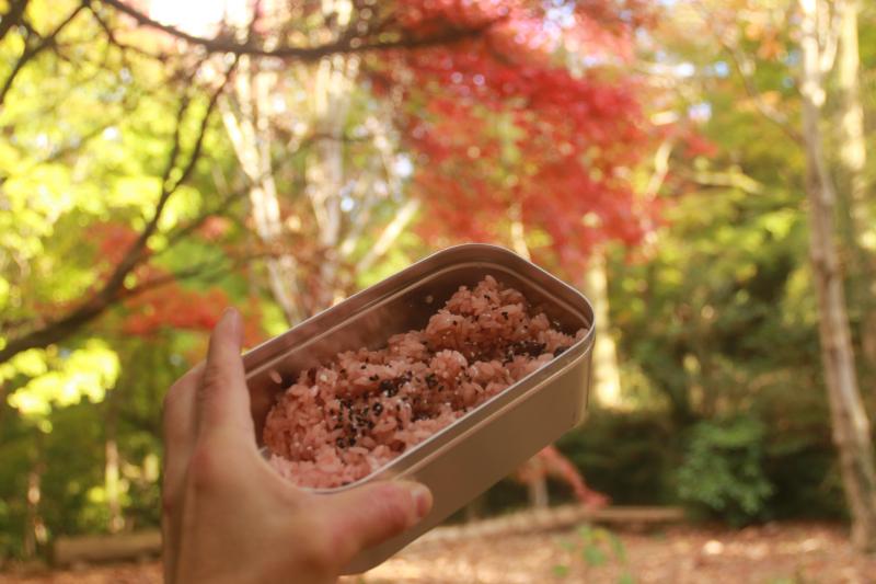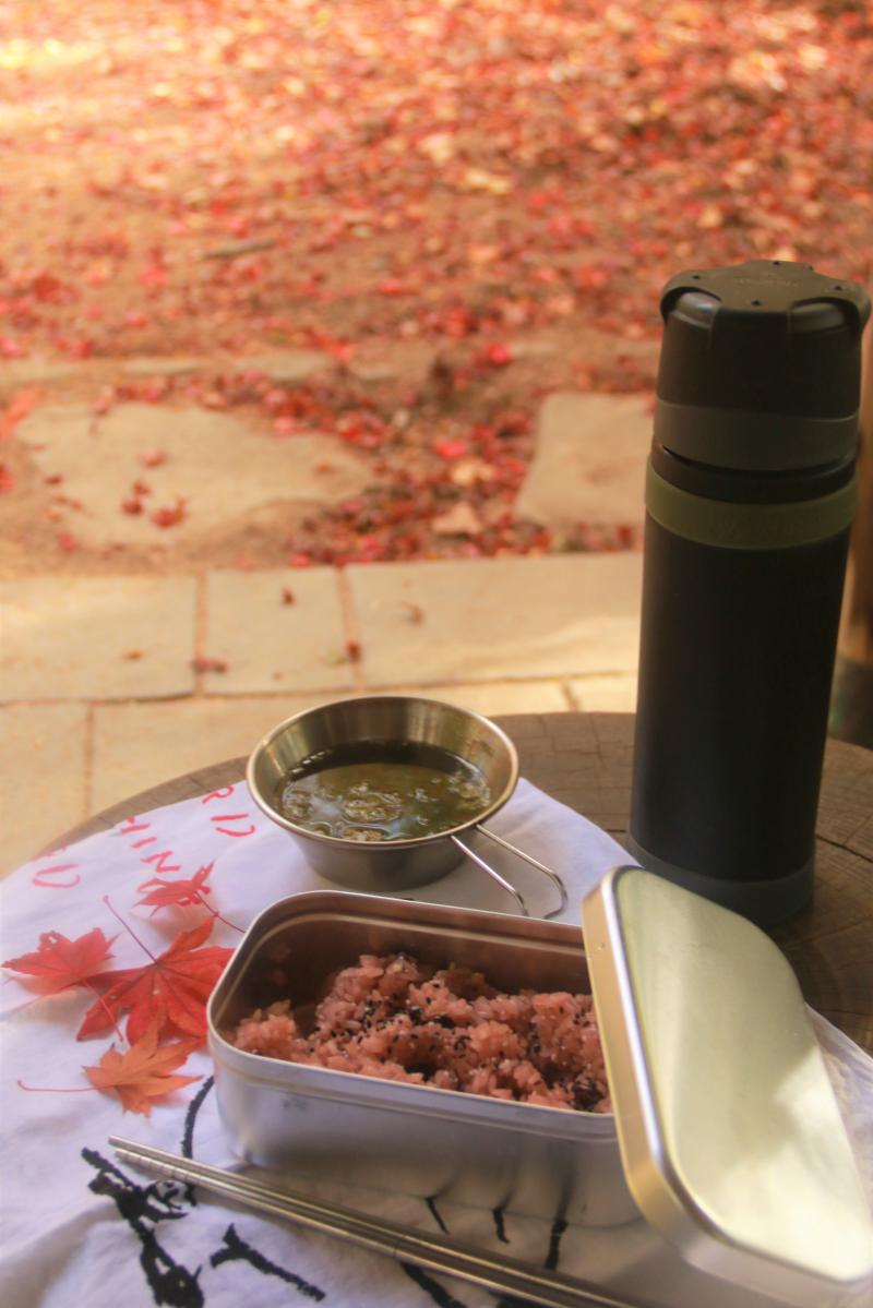 メステインお弁当で「赤飯」を山専用ボトルのお湯で溶いたスープを頂きました。