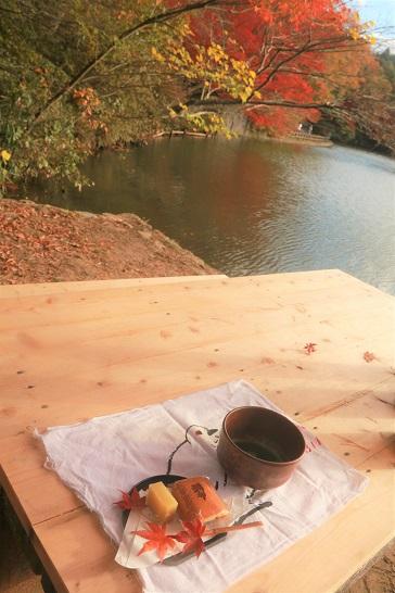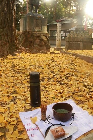 公園で紅葉の木の下で野点を致します。お菓子は「芋羊羹」美味でした。