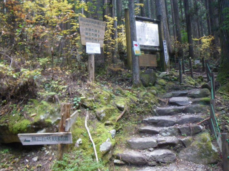 ②駐車場から舗装路を進むと登山道入口があります。左手のゲートを少し進んでもすぐに登山道入口があり、短距離の株杉周回になっています