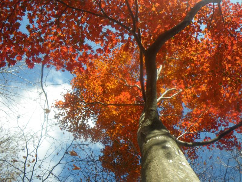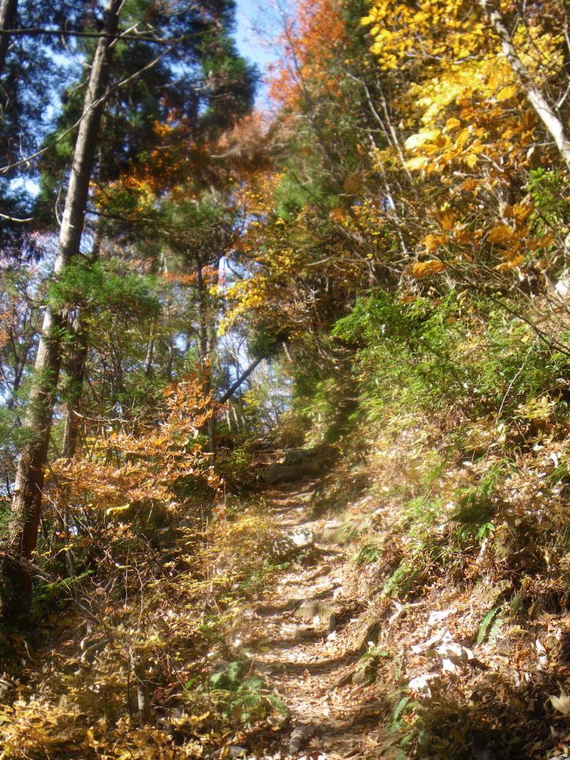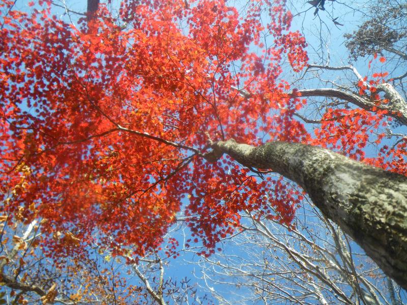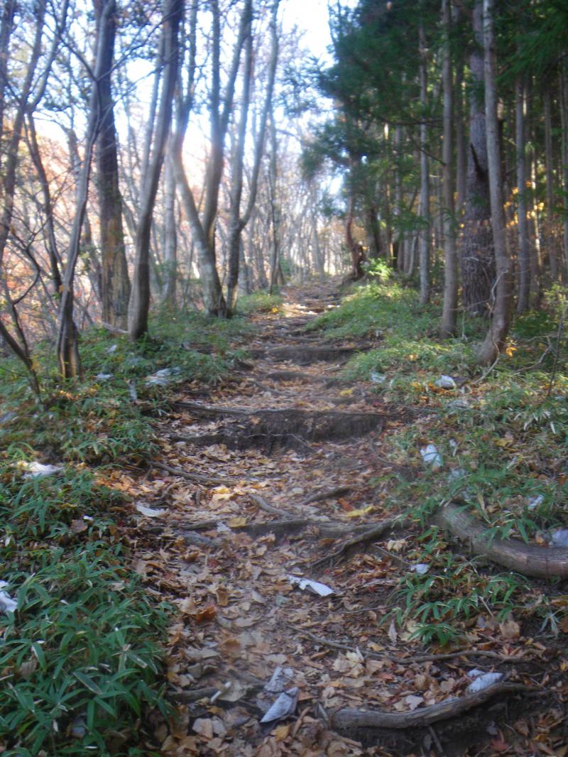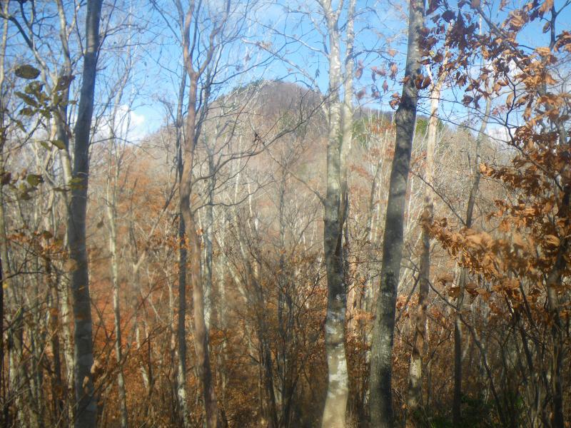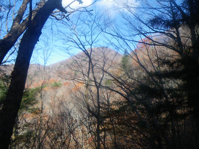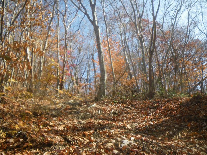 山頂からは本来なら白山・御獄やアルプスが拝めますが、今日はもう一つで、冬季に来るとなかなかよいかもしれません。今日は往路を下りますが、落ち葉が積もった登山道はふかふかで歩きやすく、短時間で下山できました。奥牧谷コースの源流地帯を歩くと、さらにきれいな紅葉が見られるかもしれませんので機会があればまた来たいと思います。