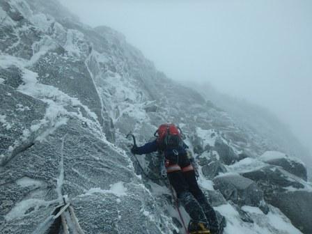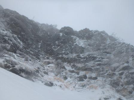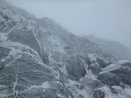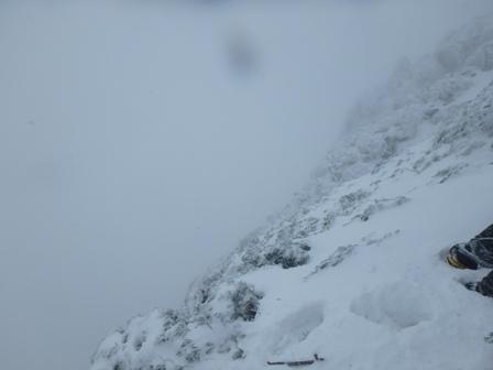 当初は正面壁の予定を化物岩に変更しさくっと登ることにして出発。安静火口はまでは雪が少なくササがかなり出ている。途中、スノーシューをデポして化物岩取り付き地点へ。気温がさほど低くないが風が強いのと視界が悪い。化物岩もあまり雪が付いておらず、おかげでプロテクションは取りやすかった。1ピッチ目をリードさせてもらい2,3ピッチをパートナーがリード。2,3ピッチ目は流石に寒くビレージャケットを着たままフォローした。