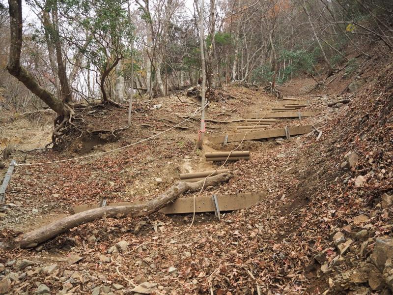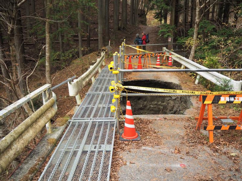 が、いきなりの道路陥没。もちろん仮設の道ができていましたが、この陥没具合に自然の恐ろしさを感じます。そのあとも所々崩壊している登山道があり注意が必要でした。また登山道に落ち葉が覆いかぶさり滑りやすく、さらに岩などを隠してしまうのでその点でも要注意です。
