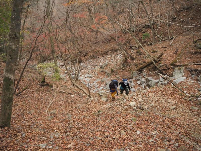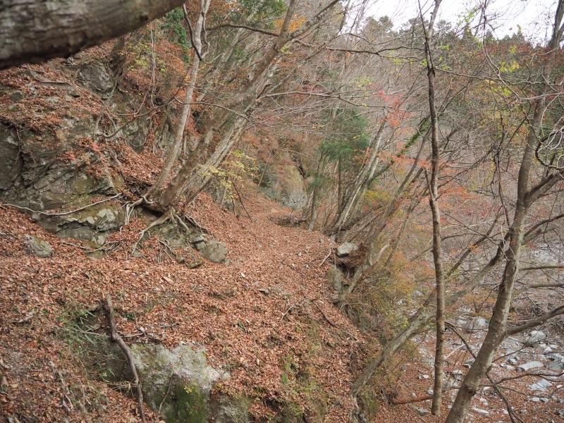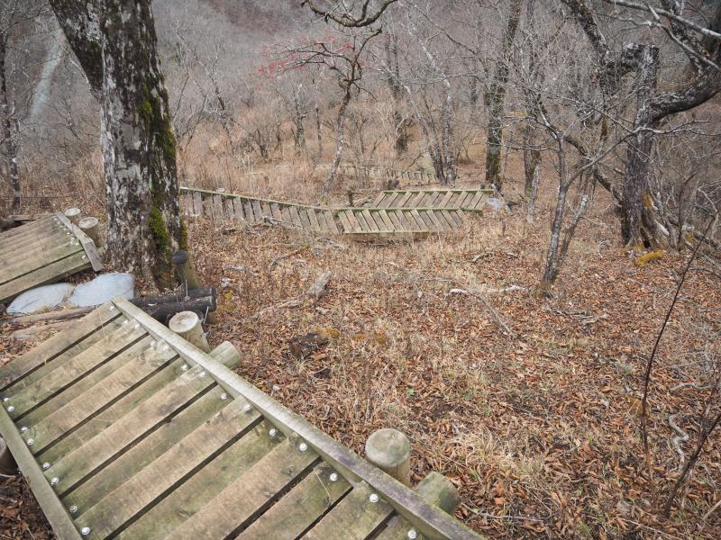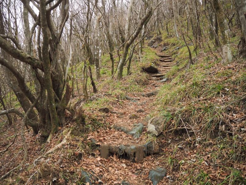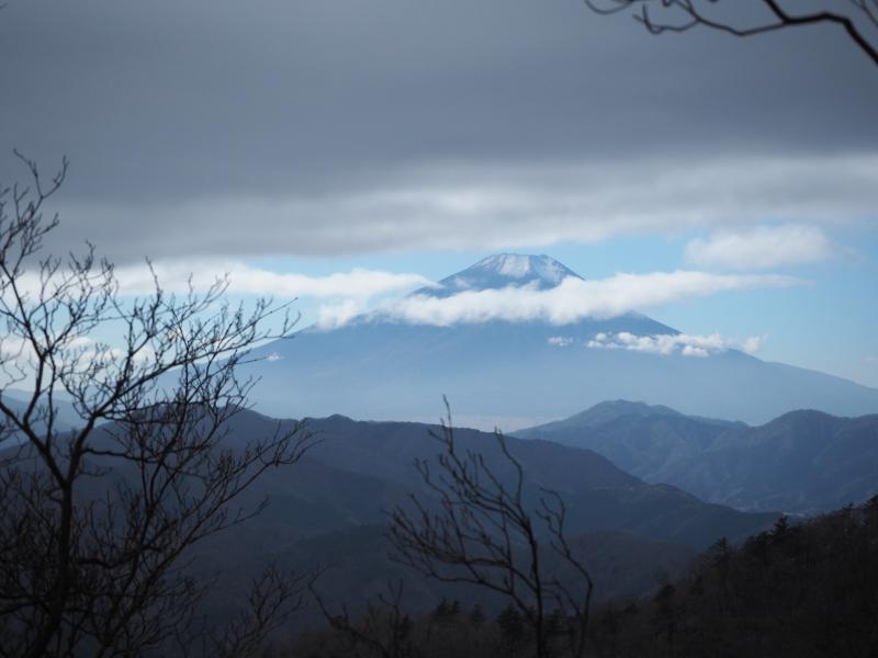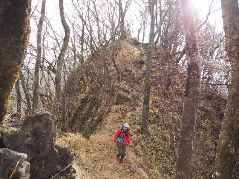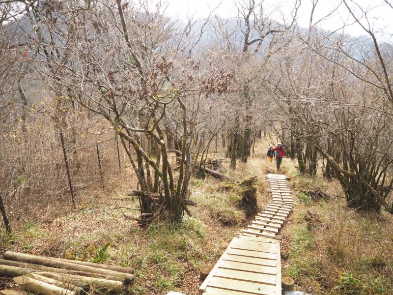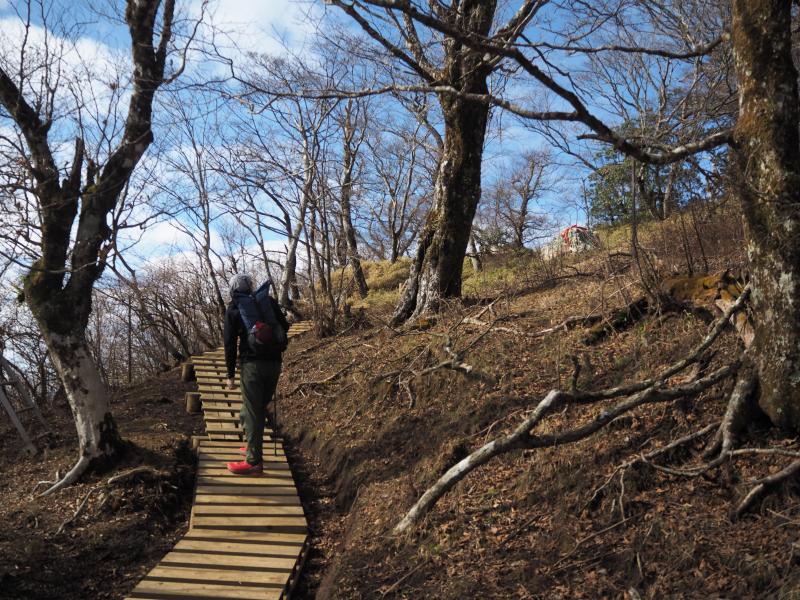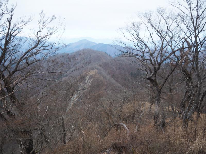 犬越路を過ぎて稜線歩き。次第に急な登りになってきます。木々はすっかり葉を落とし完全にハゲ山です。でも空は曇り空、、、