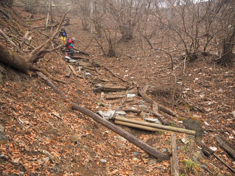 白石峠への下りが一番荒れていました。雨も加わりさらに滑りやすく慎重に下ります。
