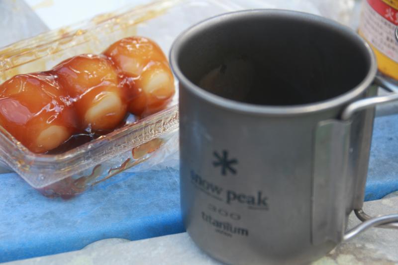 帰り道、山専のお湯をシングルコップで沸かして、ドリップ珈琲(粉は挽いてきたもの)と大津名物「みたらし団子」(ビッグサイズ)を頂きました。とっても美味しかったです。