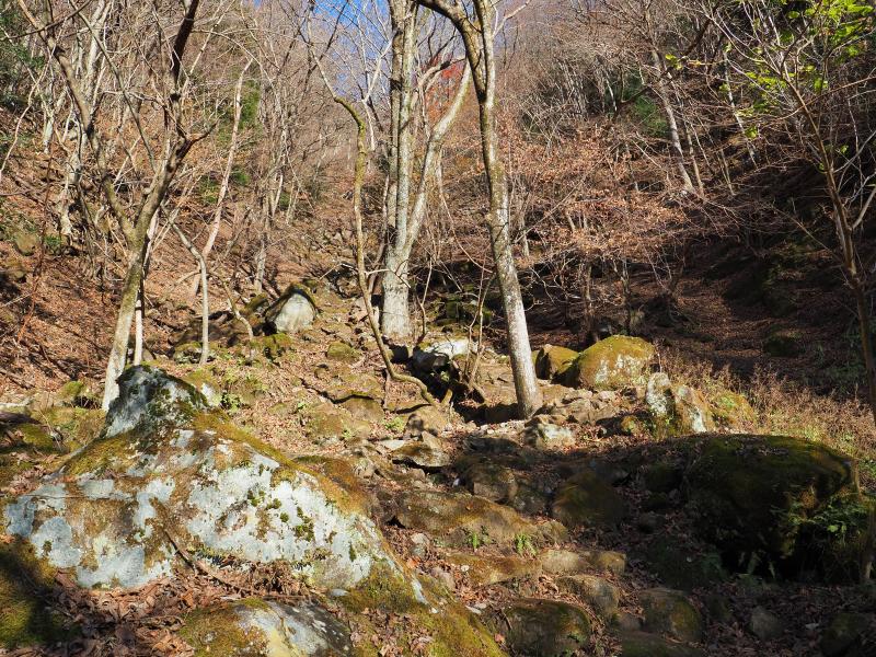 ・割石峠からの下り割石沢はガレていたり岩に苔が付いていたりと滑りやすい。