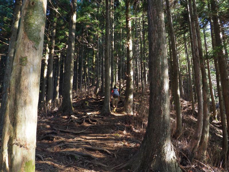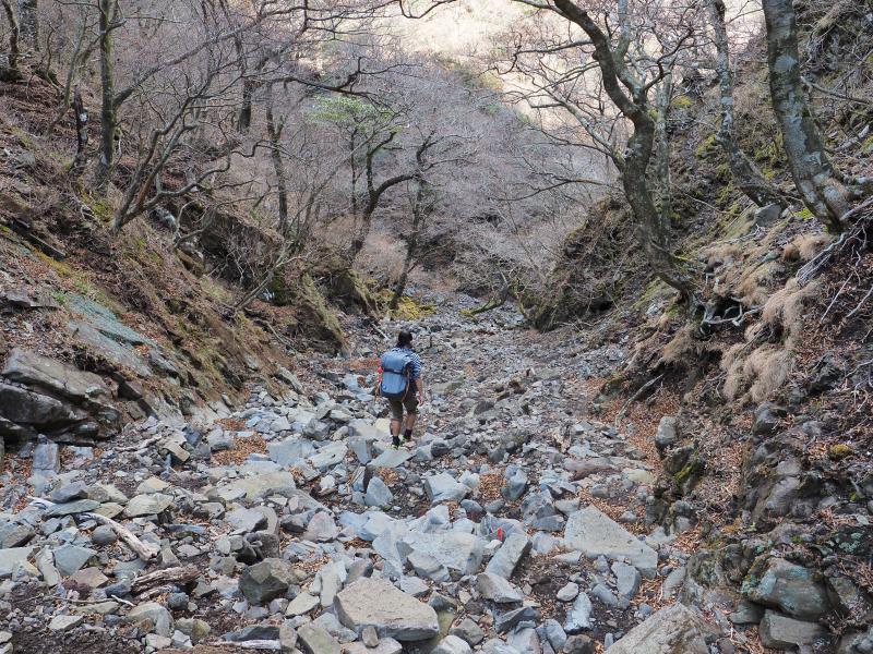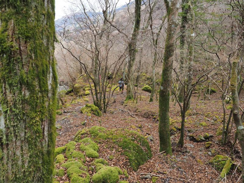 昼休憩を終えて呼子岳へ。道幅の狭い尾根のアップダウン。この辺は崩壊が激しいようで左右は切れ落ちてるところが多いです。割石峠から大沢を下ります。水は流れていませんでしたが、沢沿いの道なのでガレていたりと滑りやすかったり少々歩き辛いです。標高が下がってくると苔の緑がとても綺麗でした。