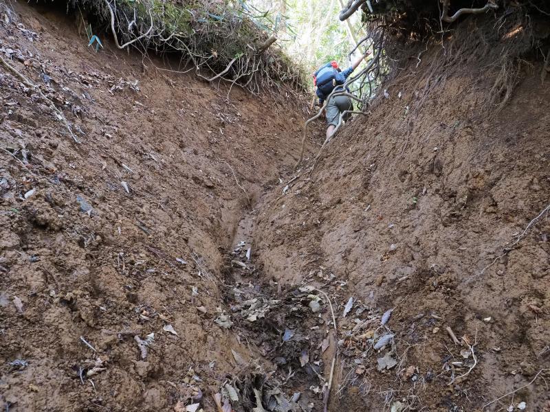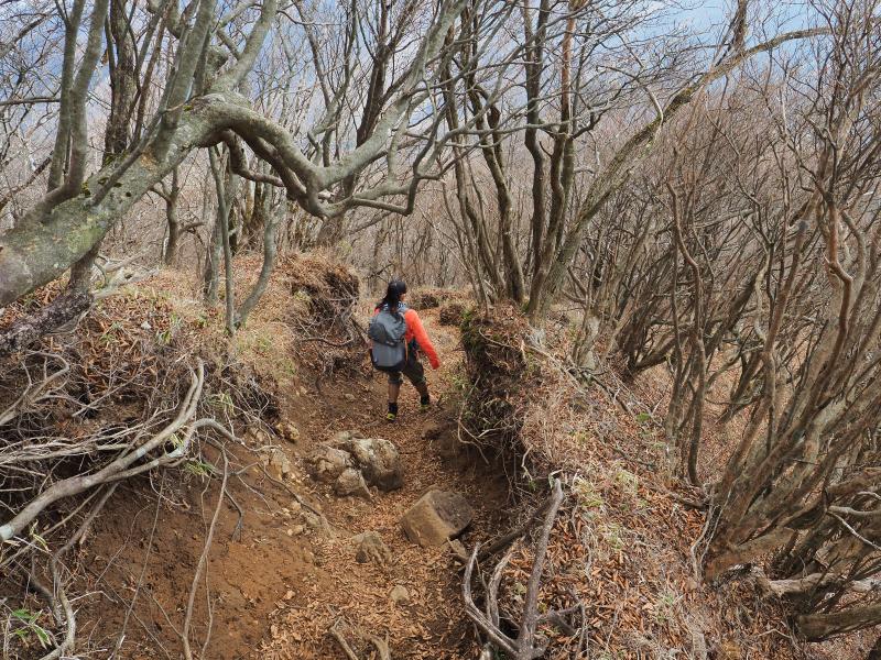 ・富士見峠〜越前岳は雨水でえぐられた登山道が多く、ヌメっていて滑りやすい。