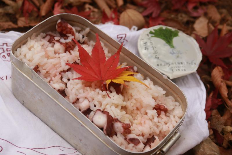 紅葉絨毯にてしばしお昼ご飯です。友人から頂いた採りたての「明石蛸」を使用して