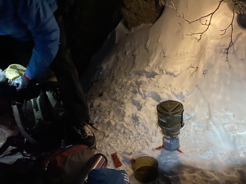 二人ともテルモスの湯が無くなったのでバーナーでお湯を沸かして補充。