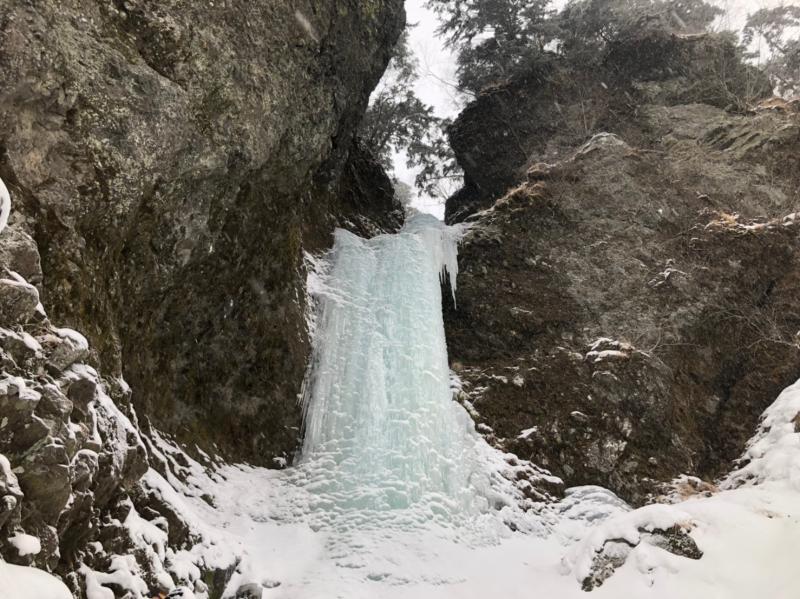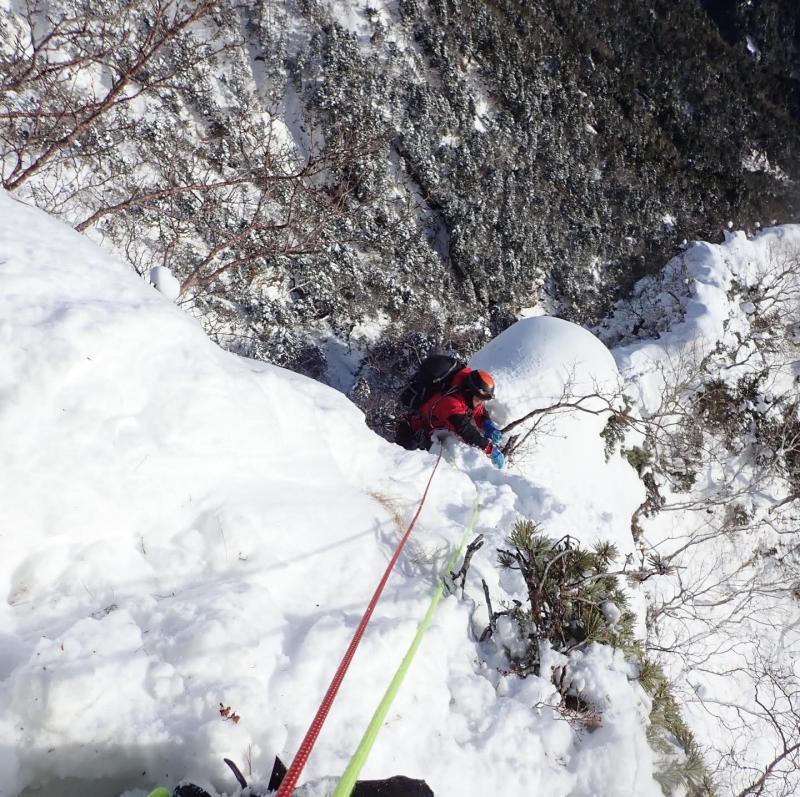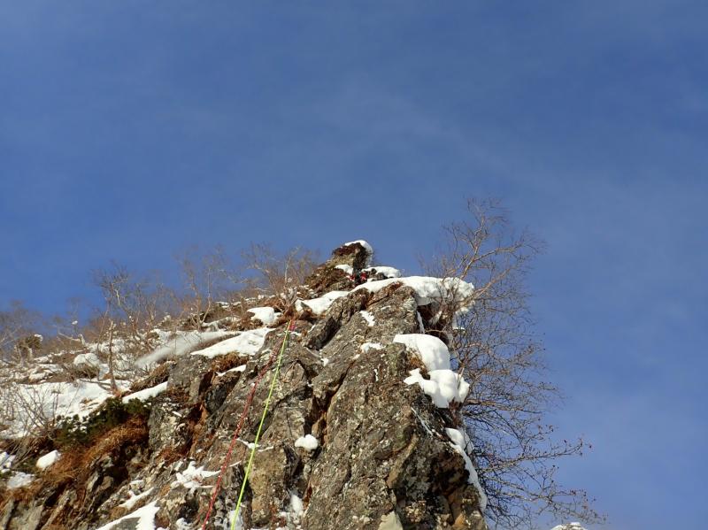傾斜は落ちるが立体的な形状で面白かった。雪に埋まったナメ滝を登りきって岩にスリングを巻き付けビレイした。