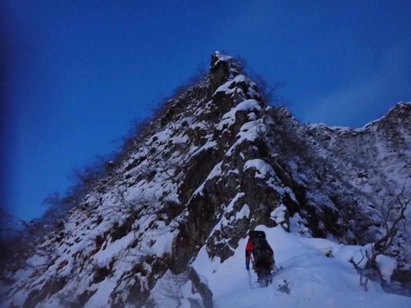 この尾根は旭東稜から一本東の尾根となり、このまま登ってしまうと岩に阻まれ行き詰まる。