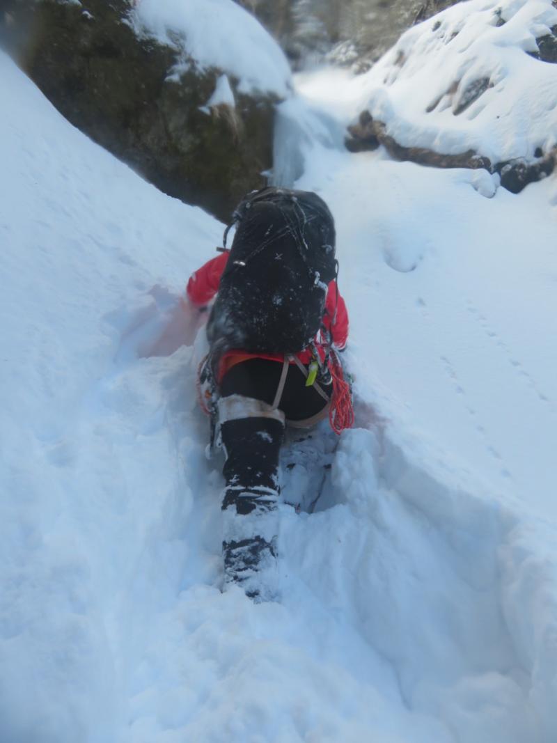 上ノ権現沢は真っ白の世界で、岩の上にのった新雪に苦労しながら進む。