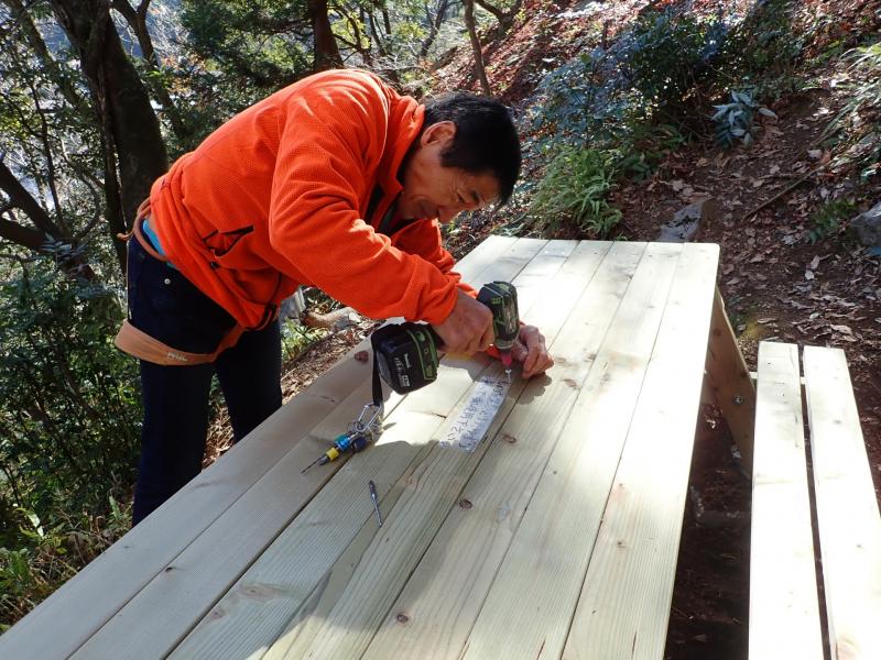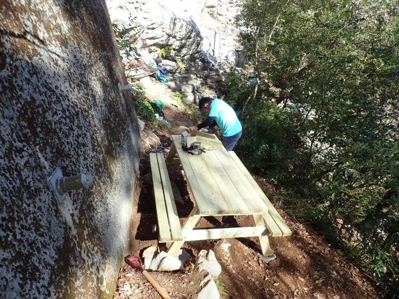 岩場に資材を運び揚げ、「僕はベンチをつくるから、登っておいて」とおっしゃったので、左の方のやさしいルートを3人で2本登って戻ると、もう完成するところであった。