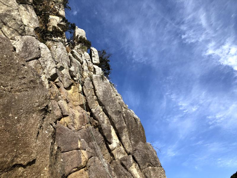 作戦通りにルートの偵察をしたあと、掃除、ボルト打ちを行い、その間に私はクラック用のカムをプリセットした。