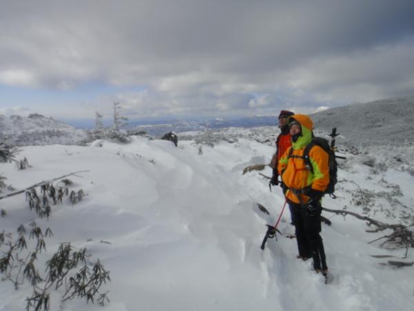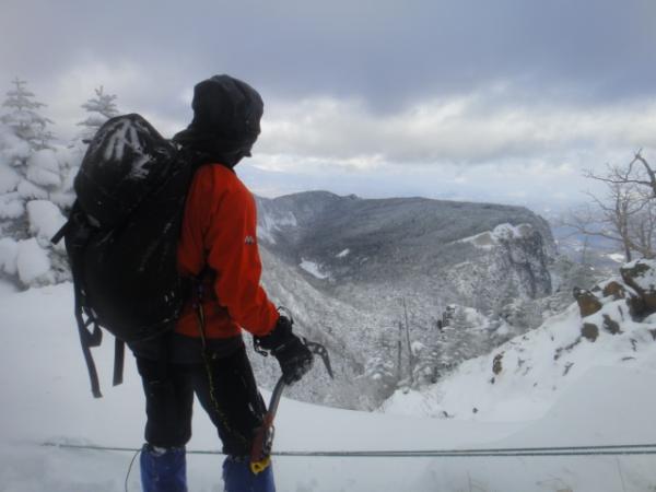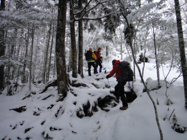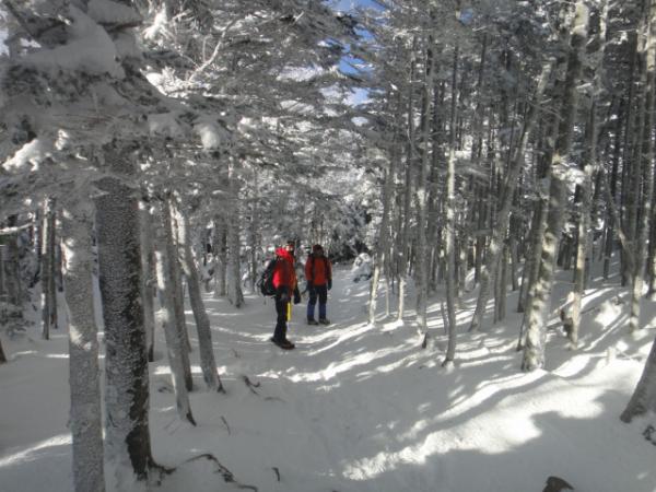 という訳で、森を抜ける少し手前でアイゼンを履きます。12本は初めてなもので、高野さんに色々と指導して頂き、ビシビシ進みます。「どこがダメなんだろうねー」と言っていたら、中山峠から尾根が方向を変える箇所にありました。最早、壁www