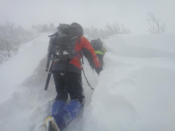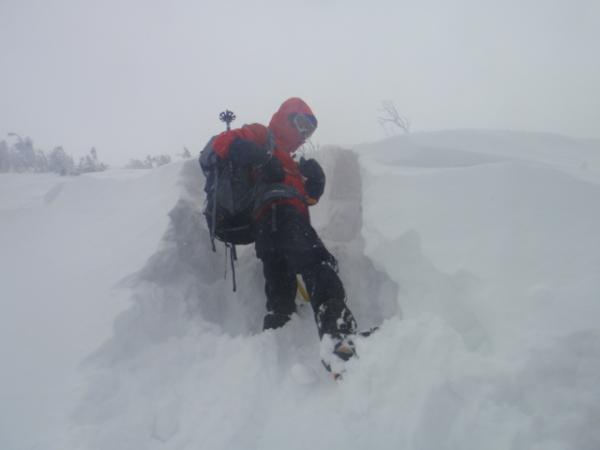 お昼休憩後、出来るだけ上を目指して歩くことに。実はヒュッテ到着までにすれ違った方々からのタレこみで、稜線の雪が大変なことになっていると知らされていました。全員が敗退です。どうやら前日の雪が猛烈だったらしい。
