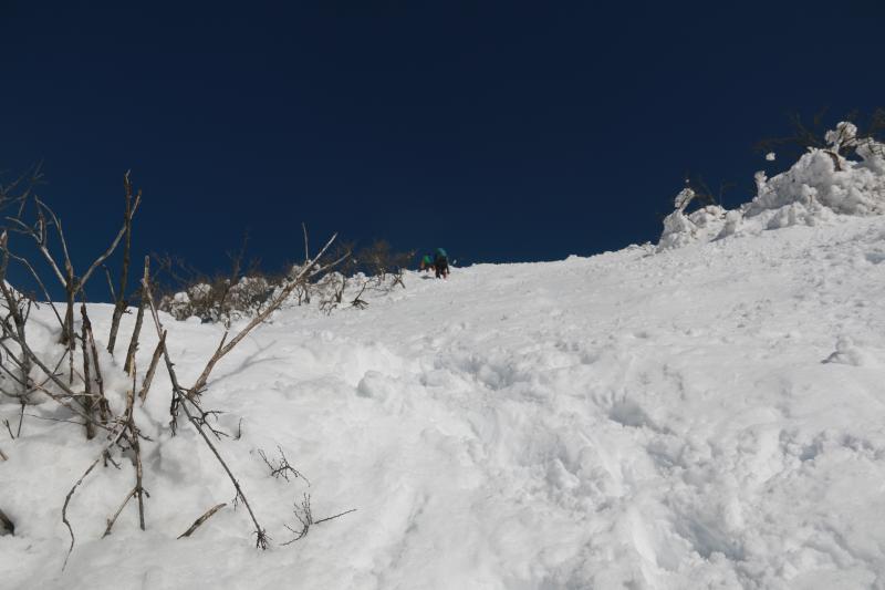 直登が好きで、ピッケルでがつがつ登りたいところでしたが、雪の状態はストックで大丈夫なしまってるけれどサクサクでしたので登りはストックで進みました。