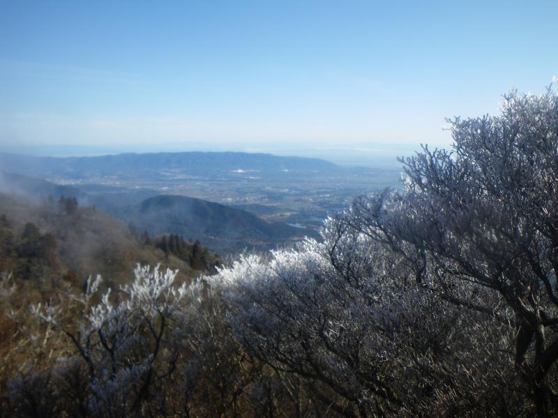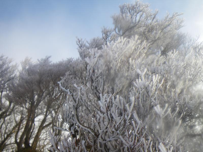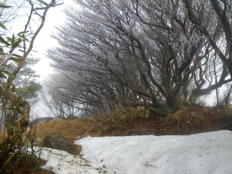しかし鈴鹿の未成区間(根の平峠~羽鳥峰峠間)を走破するために登りました。中尾根は急な松尾尾根のバイパス的な尾根で登りやすい登山道ですが、松尾尾根との合流手前の岩峰群を巻くあたりからやや険しくなります。雪があると厄介かもしれませんが、今回は全く雪なしでした。しかし風が強いのできれいな樹氷ができていました。