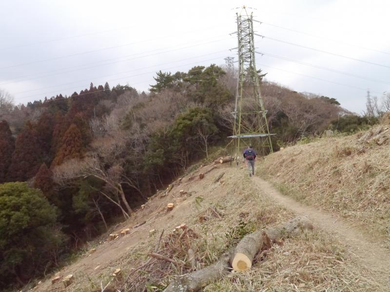 ・金鳥山を過ぎて424.5mピークまでの間で高圧送電線鉄塔の付替え工事あり。周囲の樹木が伐採されています。