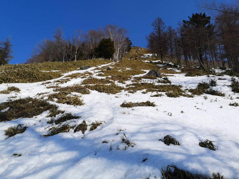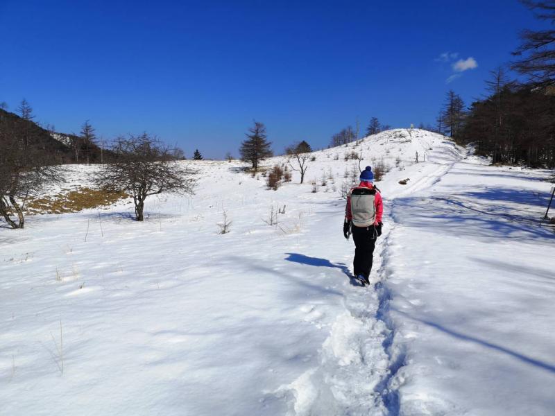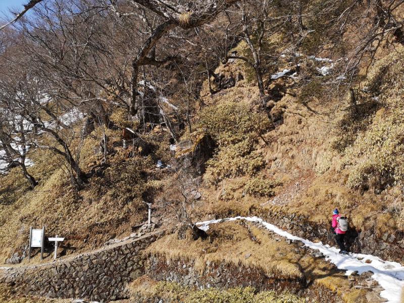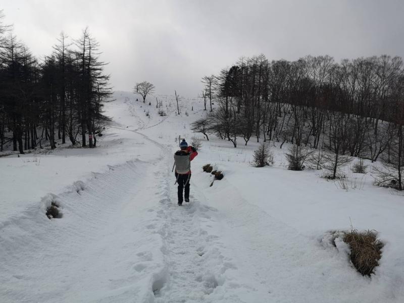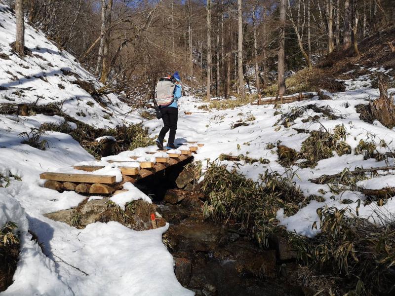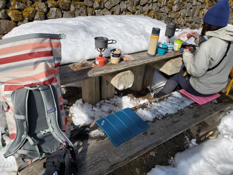 ・日陰になっている登山道は凍っているので軽アイゼンやストック必要です。降雪後は小屋より上では腰まで潜る場合もあるようなので、ワカンがあると良さそうです。