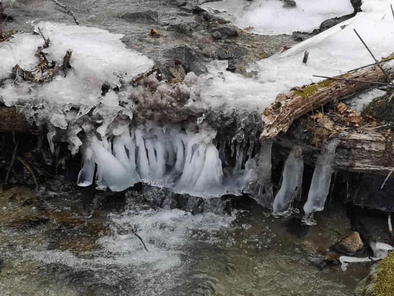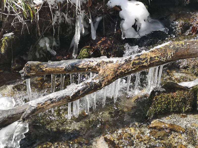 ランチをとって食後のコーヒーを啜っていると、空から白いものがちらちら。青かった空はいつの間にか真っ白、慌ててパッキングし下山に取りかかりました。下山は登りと少しルートを変えて沢沿いを下ります。途中様々な形の氷柱を鑑賞しながら歩きました。この氷柱もいつか溶けて海に注いでいくんだなぁ。そう思うとまたしみじみした気持ちがこみ上げてきました。
