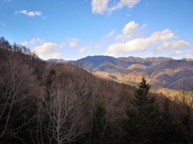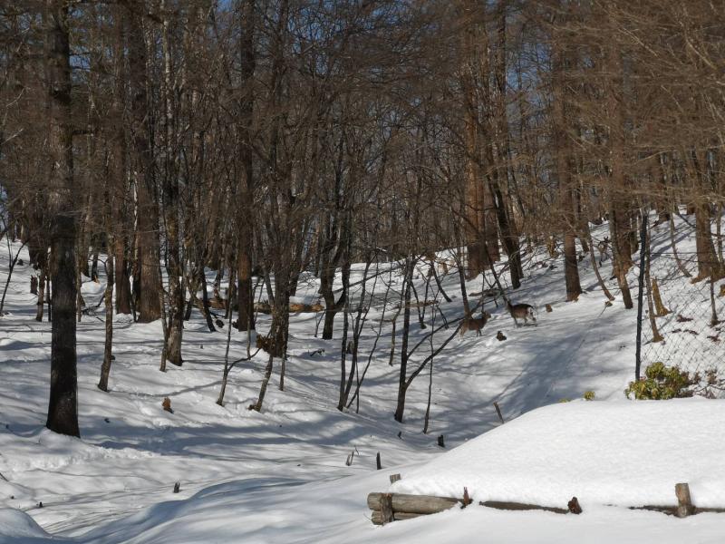 ふと顔を上げると鹿の群れがこちらを見ています。雲取山同様、この山域も鹿が多い様子。小屋周辺や山頂近くには鹿避けの柵や、木の幹にネットを巻いて獣害対策が念入りに施してありました。可愛い鹿たちも増えすぎるといろいろと大変です。