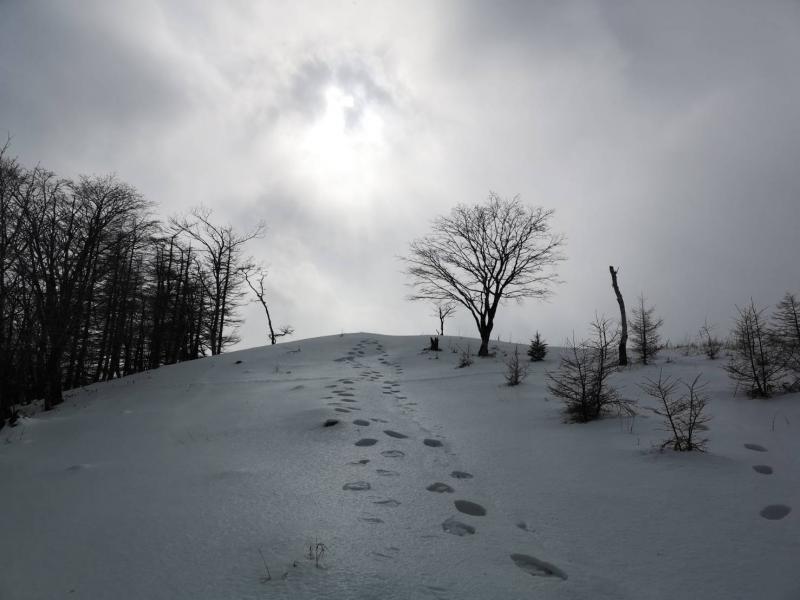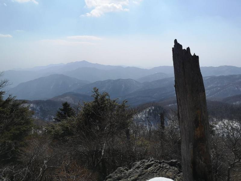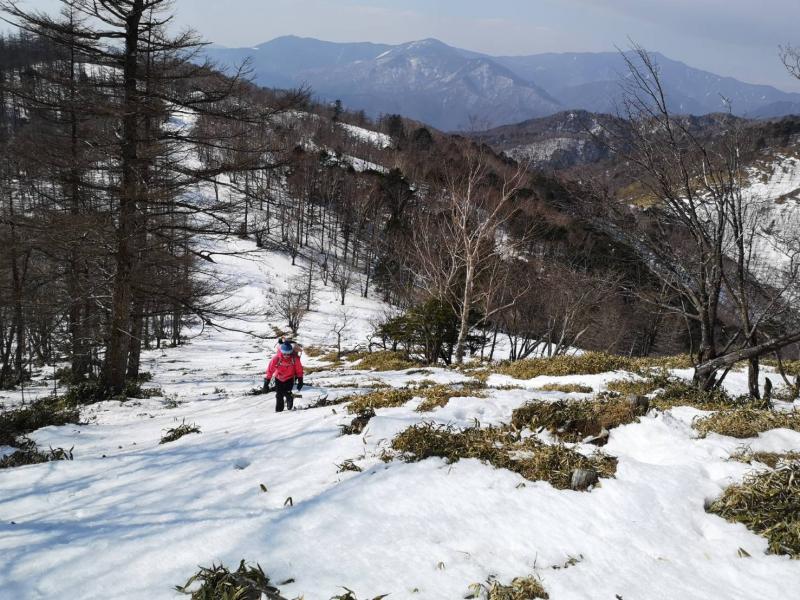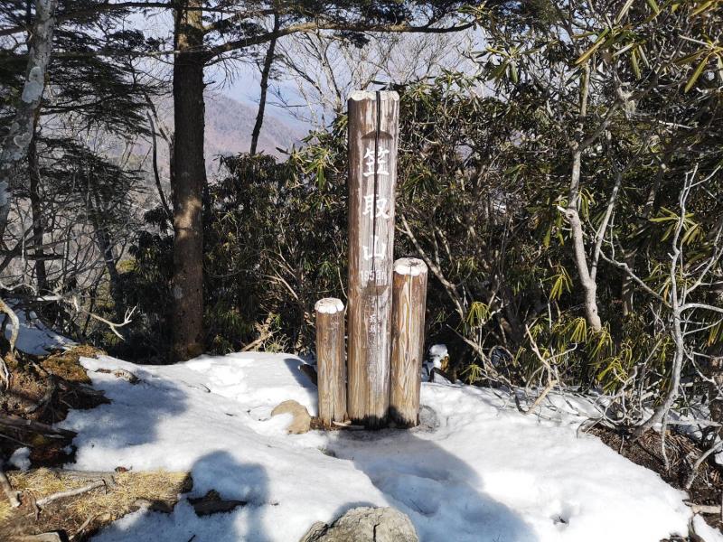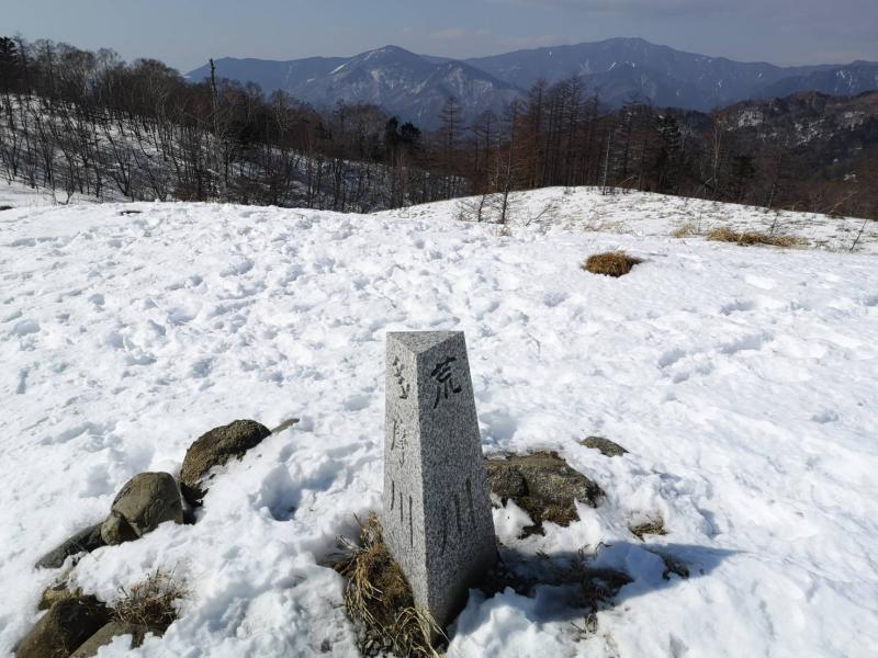 この先は狭い上に岩が露出し、場所によっては雪がべったり。少々緊張を強いられる細尾根でした。頂上からは霞んだ大菩薩が確認できましたが、暗い雲が北から流れ込んでいたので富士山や南アルプスは確認できず。長居はせず水干に向かうことにしました。