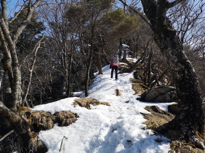 ・西峰の後10分ほど行くと最高点があります。切れ落ちた岩場に雪が付いているので通行注意。