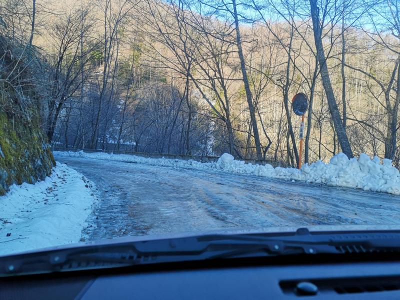 - ・作場平までのアイスバーンはかなり手強いです。スタッドレスでもハンドルを取られるので10km/h以下で慎重運転に努めてください。午後になっても半分も溶けません。帰りは登りになるのでFFだときついです。