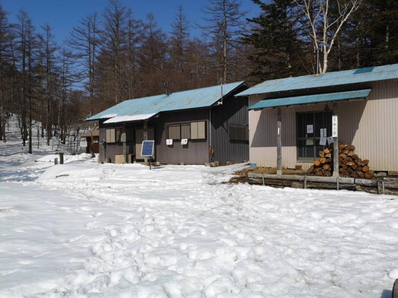 分岐から先は日が当たり、雪が緩んでぬかるんでいる部分もあったので一旦アイゼンはザックの中へ。小屋まではあっという間で、こちらの綺麗なバイオトイレもありがたく使わせてもらいました。