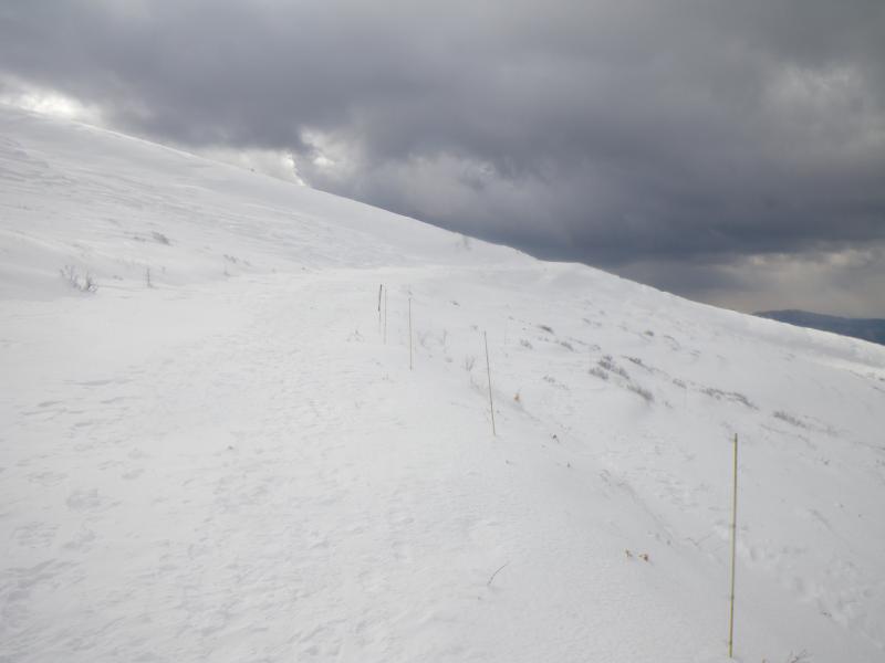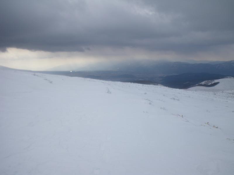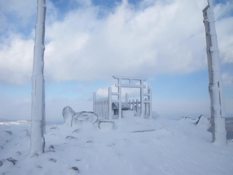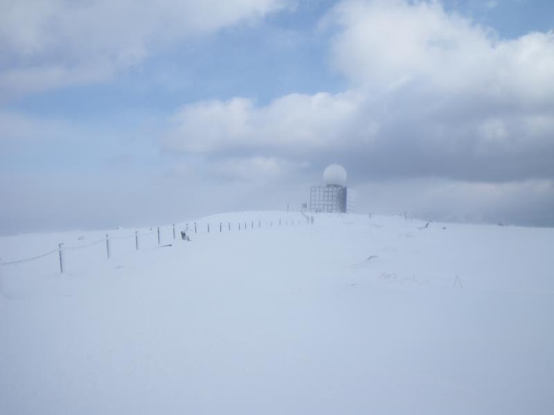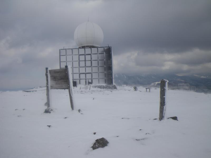 車山の肩から夏道通リに進みますが、あえて、スノーシューで行く必要もない硬さ。のんびりした傾斜で上がっていくと、そのうち気象レーダーが見え始めるます。ショートカットするとやはりスノーシューの力でスムーズ、表面だけが固くて中は柔らかい雪質なので、道を外すと埋まります。山頂付近からさらに強風が一気に増し、よくスキー場のリフトが動いているなと思いました。スキー場から上がって来る人もいますが、せっかくの新設「SKY frame」も寒すぎて誰もいません。珍しく朝から腰の具合もとても良くなく、周回もせずそのまま往復して終えました。物足りない感満載ですが、致し方なしです。