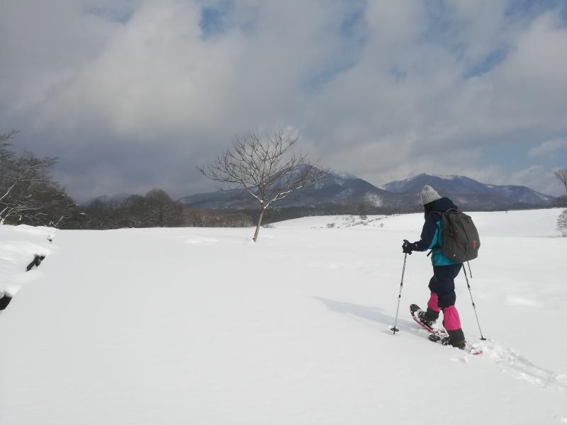 場所は蒜山高原。週末にかなり雪が解けていましたが、運よく前夜から朝に雪が降り15cmほど新雪が積もったので終始新雪をスノーシューで歩けました。